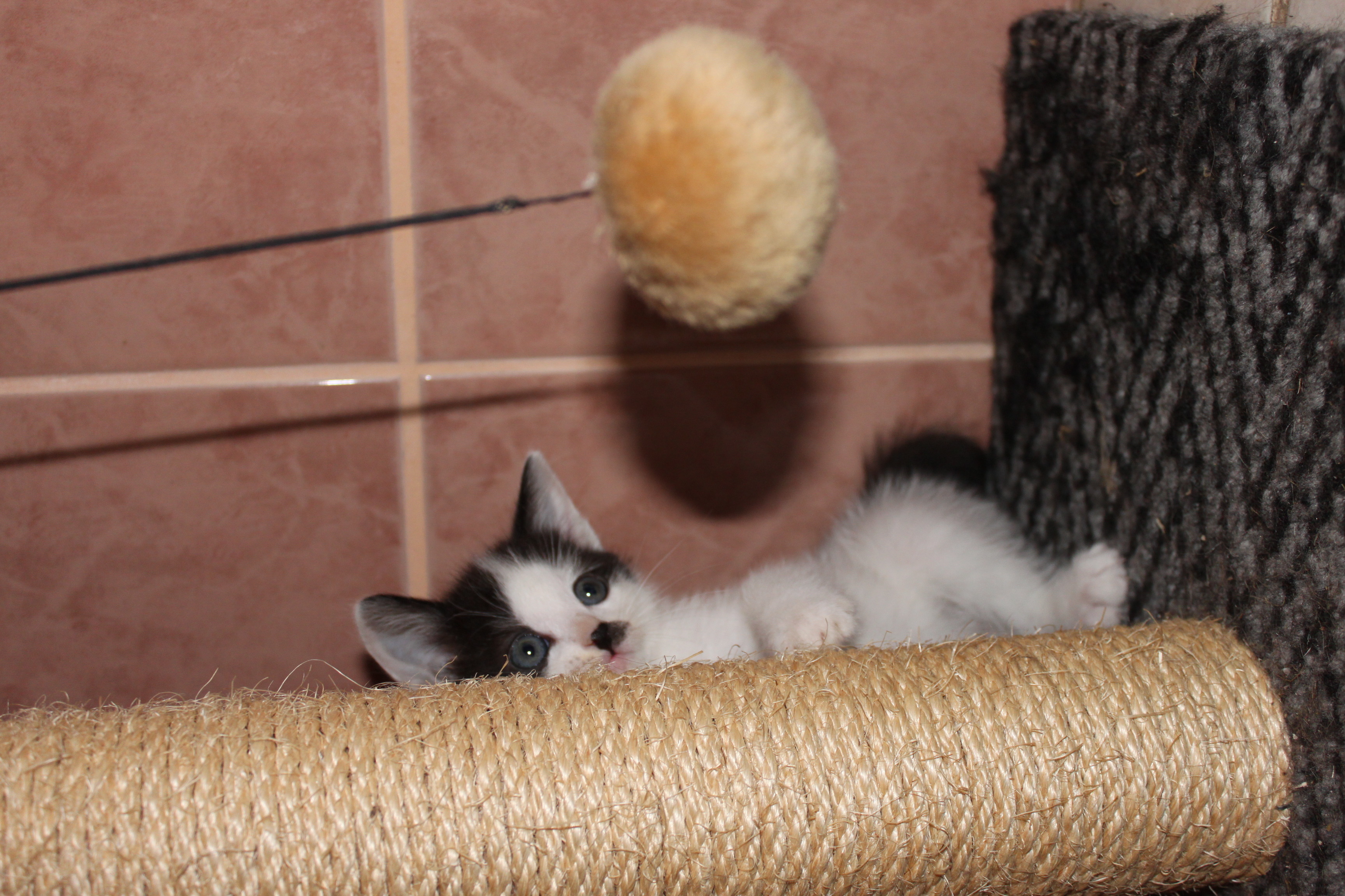 Musto is a gorgeous little fluff ball, mostly white with a black moustache and patches on his back like a moo cow. He is adventurous and is great with other cats and dogs.