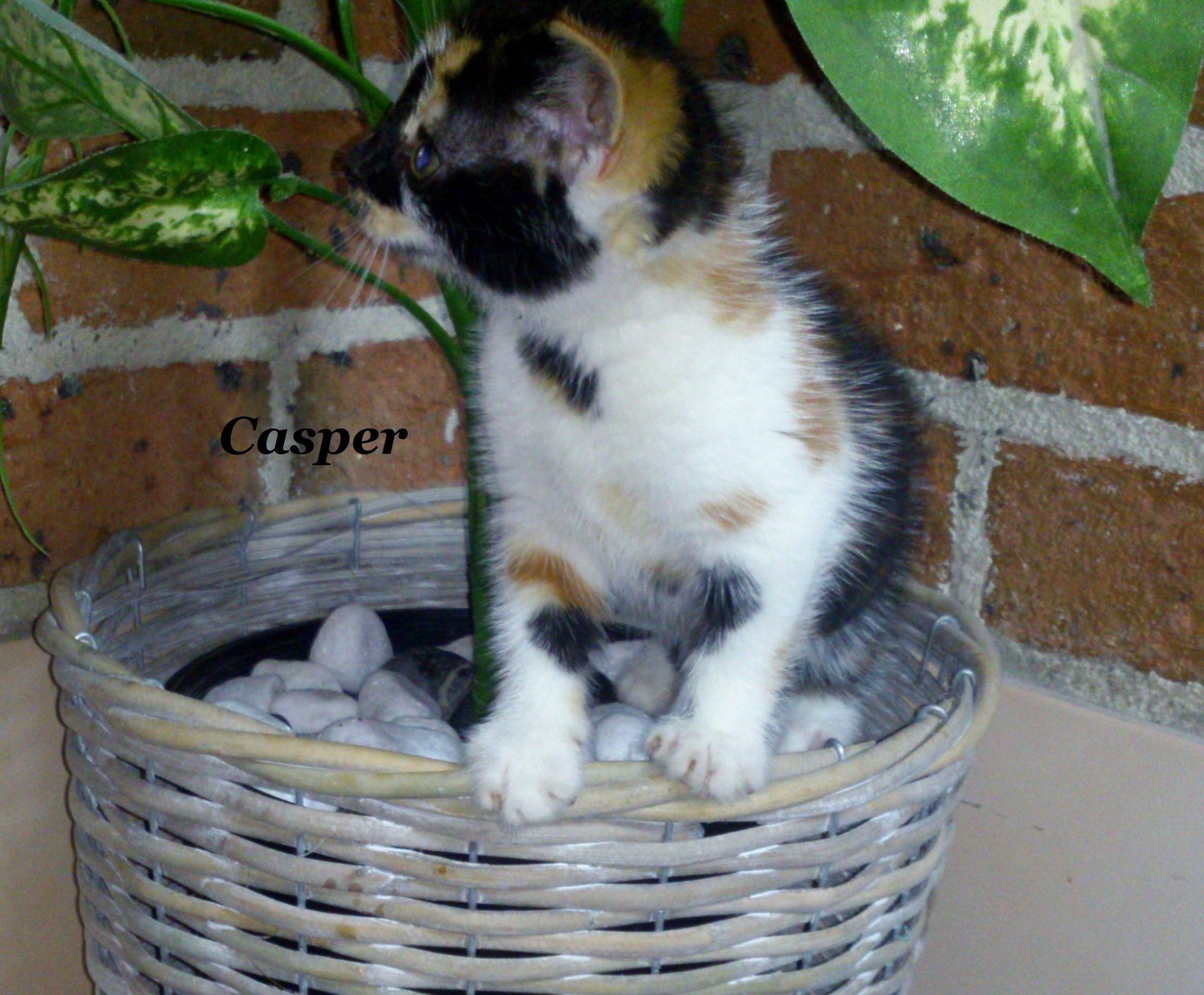 Casper was abandoned when their owner moved house, she is a healthy little girl and is a good eater. Casper gives her brothers a good workout chasing and playing with them.