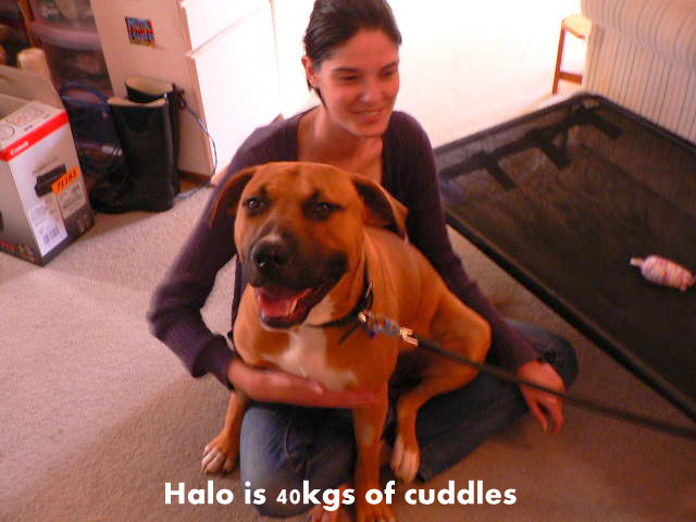 Hi, I'm Halo, a 11 month old, male, Mastiff x Ridgeback. I am 40 kgs of love and affection. I love being brushed and touched and will take all the cuddles you can give me. I love to play with my foster sister. Luckily she is a Bull Arab x so she is almost as big as me because we like to play rough. If you have a big dog that needs a playmate then I AM YOUR BOY!