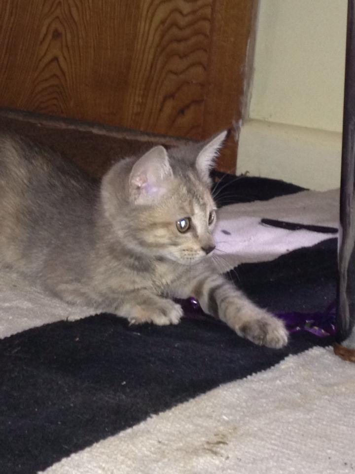 Karla is a playful little girl. Her coloring is a grey tabby with ginger through it. She is so pretty. She will be a wonderful addition to any family.