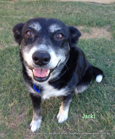 Jacki is a very loving and sweet natured, 11 yo, female, Border Collie x Kelpie. \ She has a real zest for life and sparkle in her eyes. She would make a great companion for anyone looking for a undemanding friend. And you gotta love those eyebrows! Jacki loves to laze about outside, and when we are out in the yard, she likes to follow us around. Jacki is not a barker, only when she has to. On the lead she starts off excited but calms down after a few minutes.