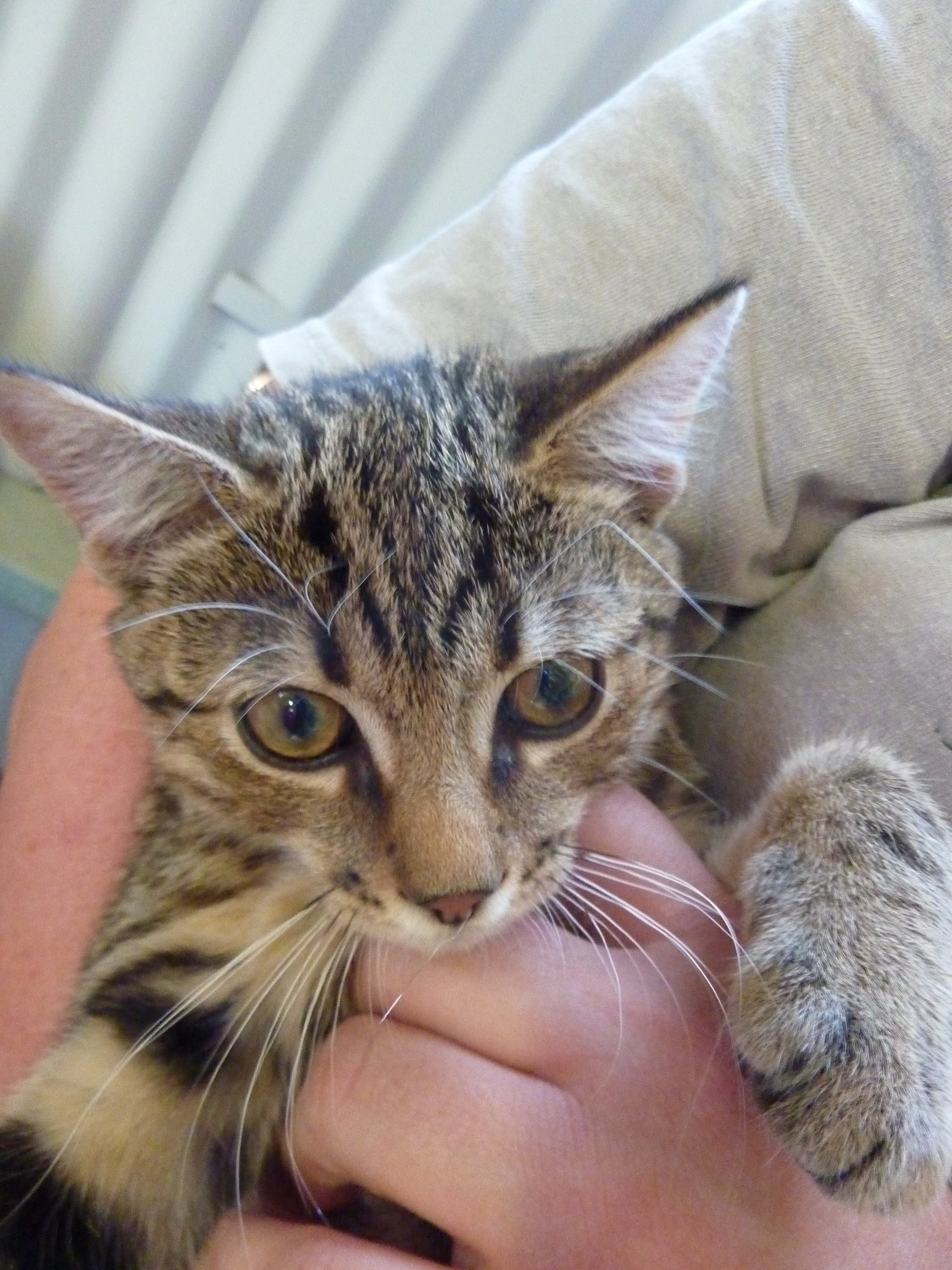 This cute little male kitten is available adoption - he is currently in foster care.
