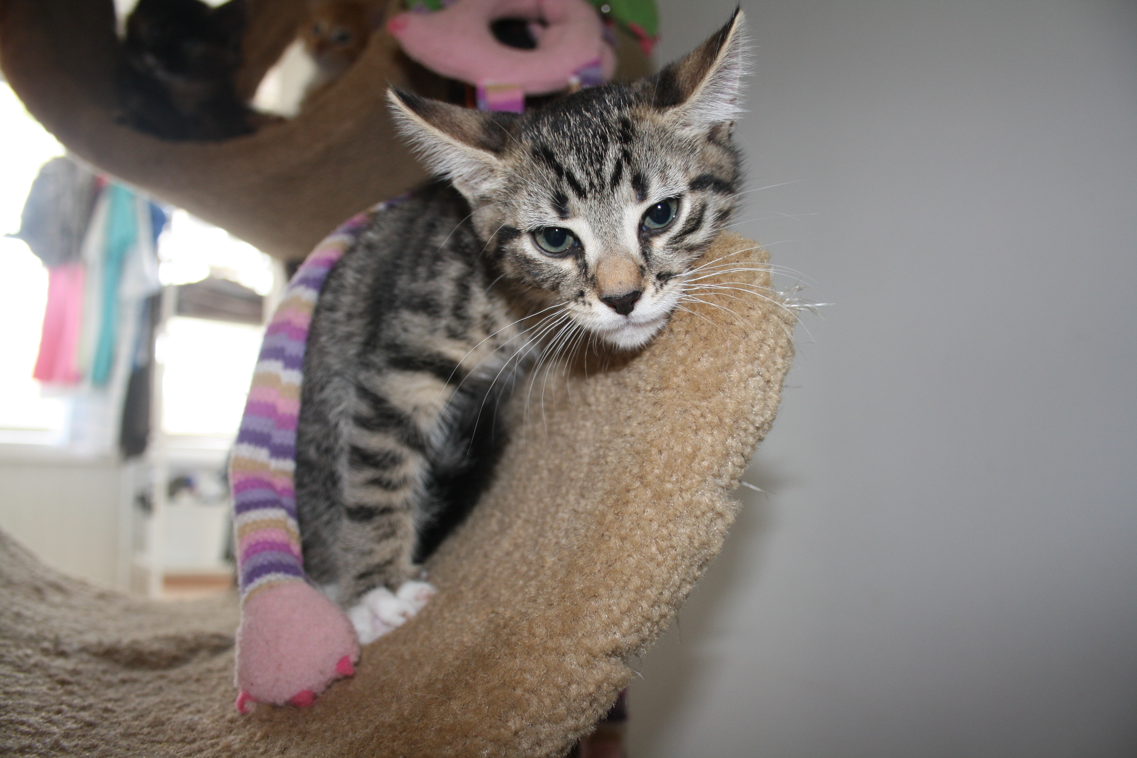 Lola is a lovely baby girl, sister to Brian. She loves playing with the other kitties in care and is being handled by the seven resident children.