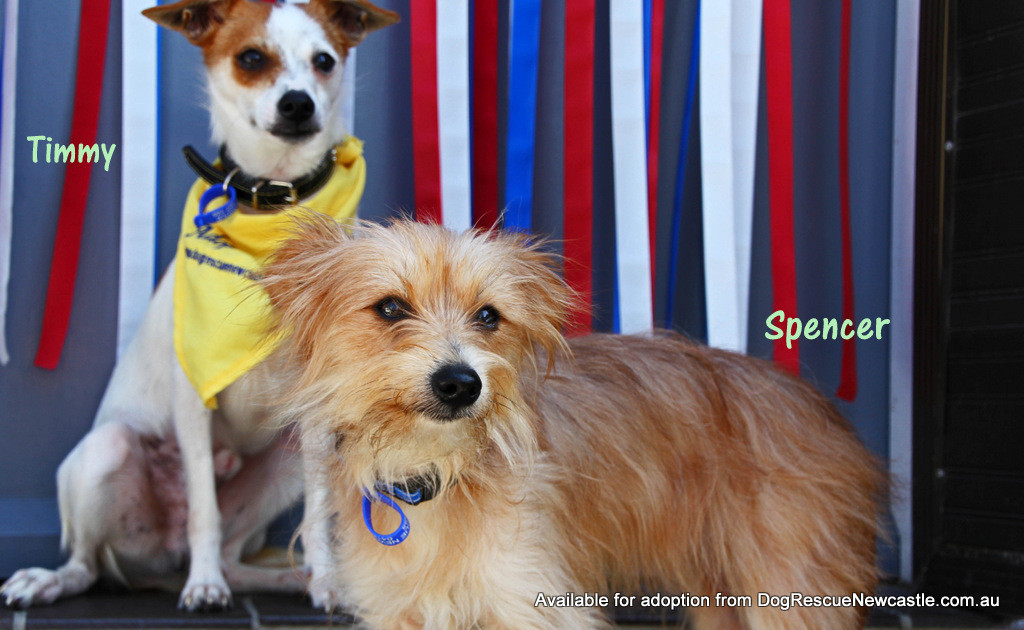 Spencer and Timmy have been through a lot together and need to stay together. They are 12 to 18 months old, Tenterfield Terrier crosses (possibly with Jack Russell and/or Australian Silky Terrier). They will keep each other company when no one is home, but love to be with people and get lots of cuddles when they can.