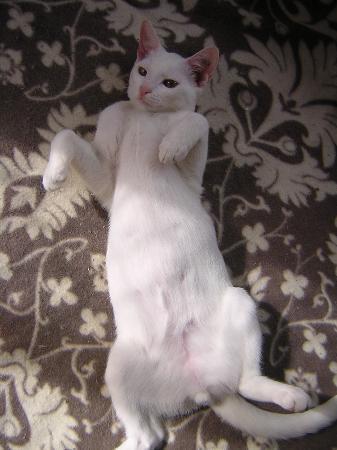 Snow's brother silk has gone to a wonderful home so just little snow is now looking for his own family. He is a gentle, laid back little boy, very friendly and adaptable. He needs to be an inside cat as he will be susceptible to sunburn