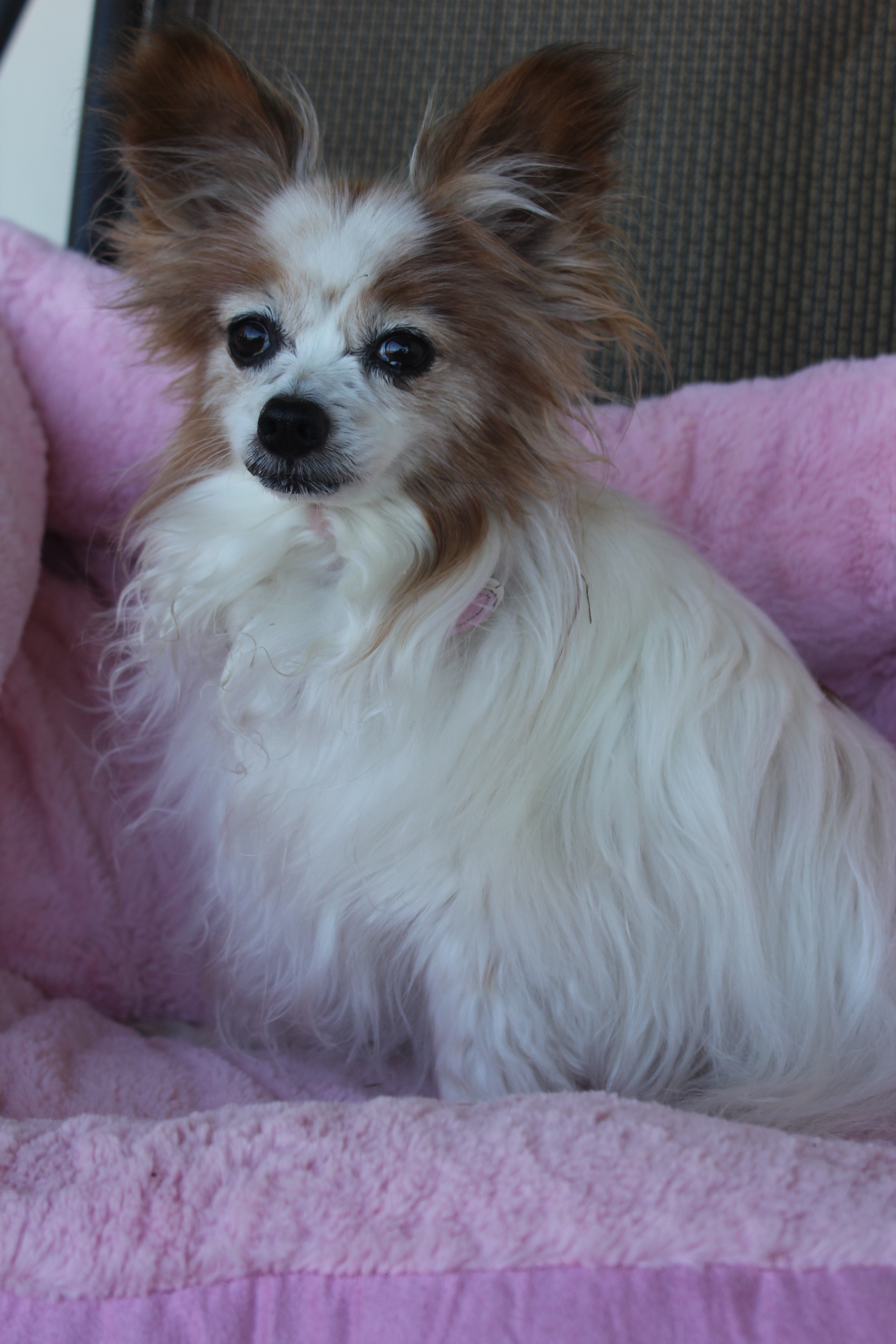 Chrissi is a sweet Pappillion who loves company, she would be ideal for an older person for company. He does have a small heart murmour which does not cause her trouble- she is not on any medications for this.