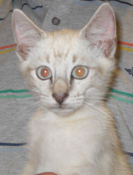 Simba could be Siamese x he has pale cream coat with coffee tabby marking, dark pointed tail/ears and gorgeous blue eyes.