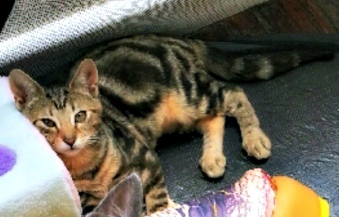 Sadie is one of the most striking looking kittens we've seen in a very long time! She is a marbled tabby with amazing red swirls!