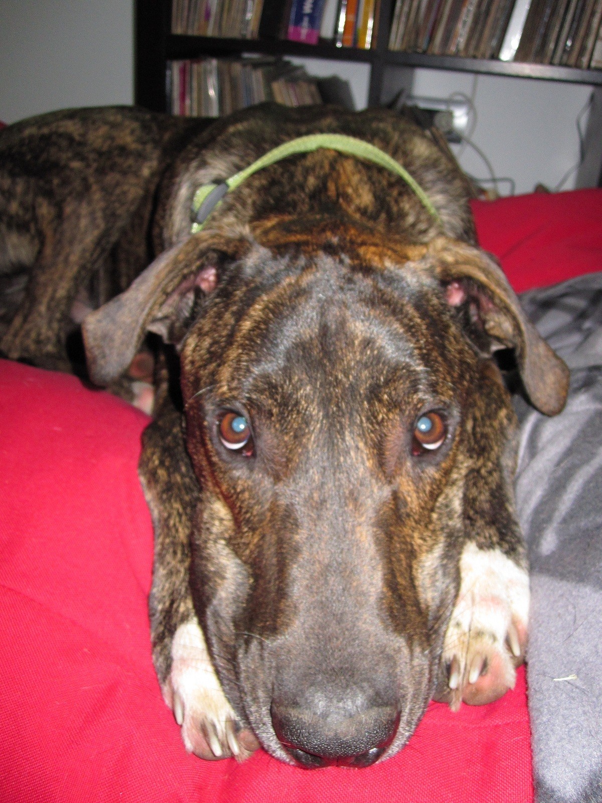 He is a brindle colour and weighs in around 45 -50 kg mark. But, if you like a dog that you won’t trip over, he’s the one for you.