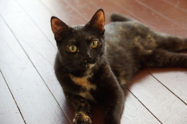 Sheri is black with light torti (brown) patches over her. A truly unique looking girl with a very special personality.