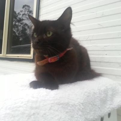 Yami is a lovely girl, who is black to look at naturally, with white tips, but as the (very poor quality) photo shows, she has brown highlights in the right light.