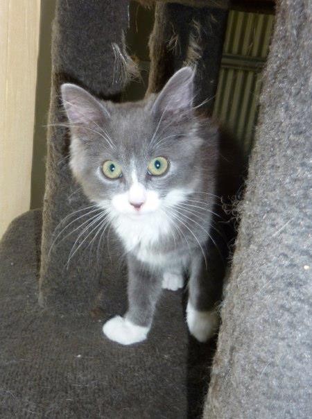 Hi I am called Burlington Bertie because of my white socks. I am a friendly playful kitten with a loud purr. My blue and white coat is semi long-haired so I will enjoy a brush along with lots of pats cuddles and spoiling.