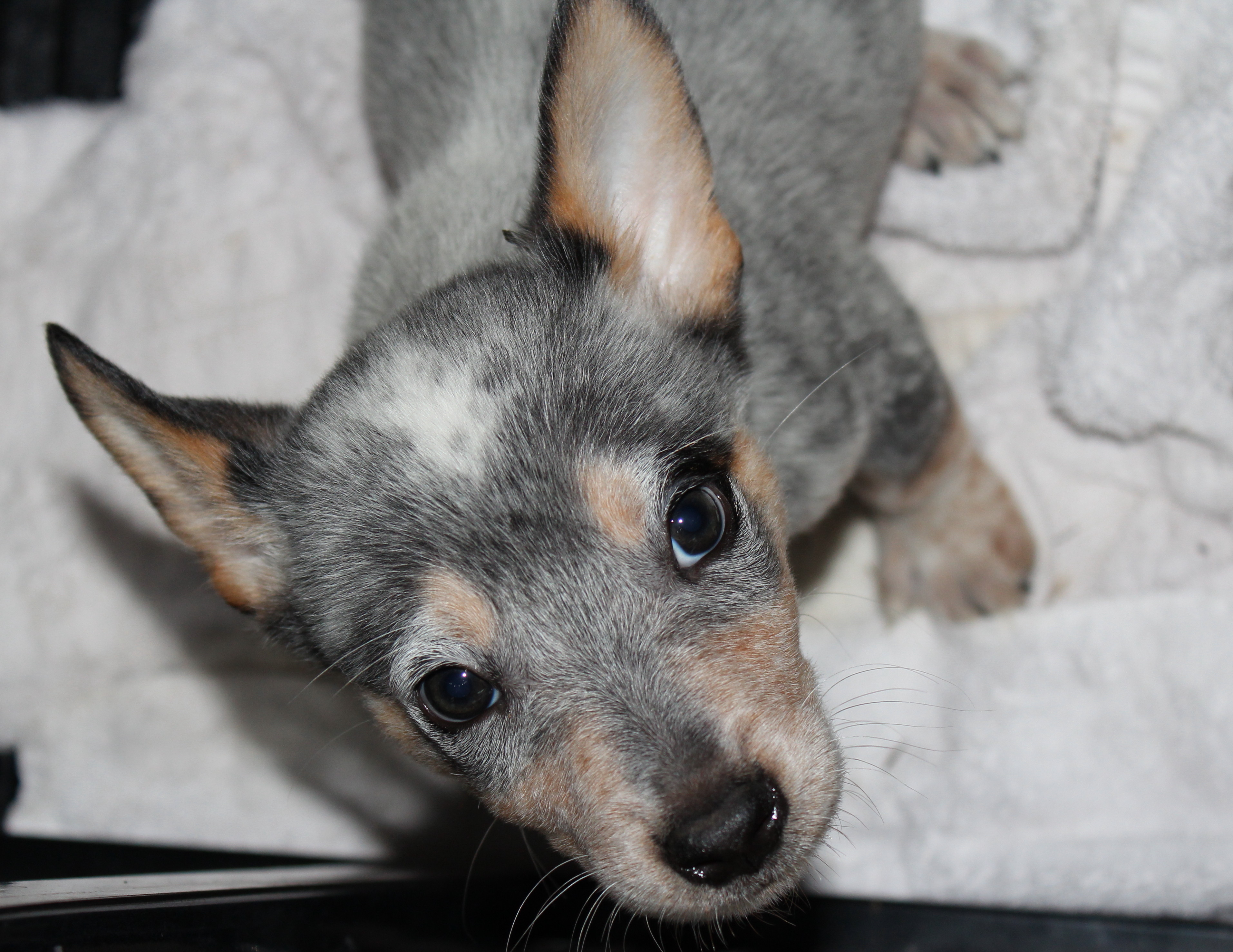 Lincoln, who is a cattle dog -a red x blue, has a face that would melt the coldest of hearts....He is so cute, and on top of that, a clever little puppy.
