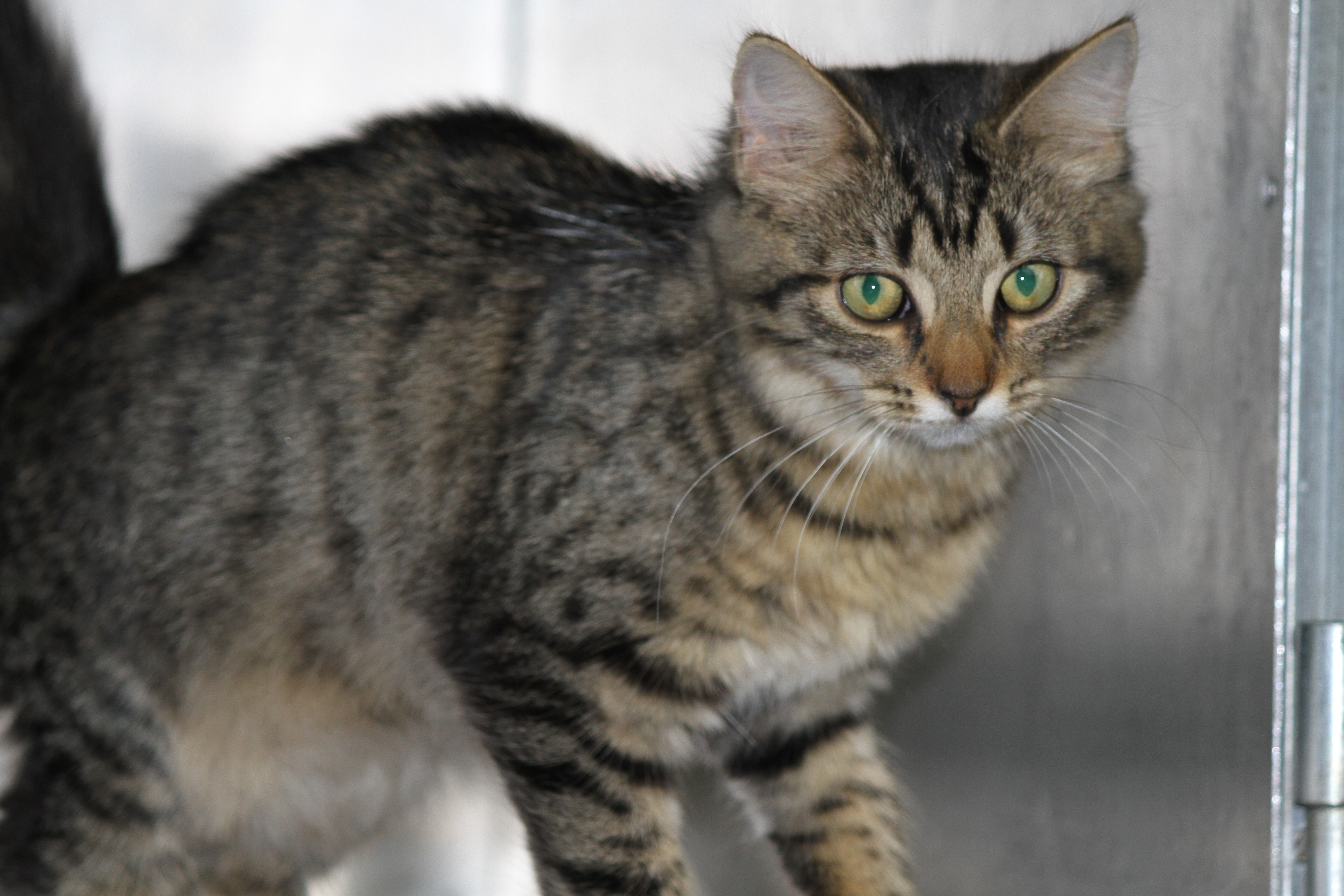 Lara is a tabby female kitten approx 4 months old. She has heaps of attitude and loves to get the attention of people for a cuddle. She is very distinct as she is a short coated cat but has an exceptionally fluffy tail.