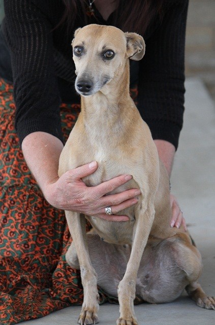 Fly is a very sweet girl is a whippet that is 5 years old. She has an extra sweet nature and loves to be around people. She likes to receive lots of gentle attention and just loves to show you that she is really a pocket dog by being as close to you as possible (preferably on your lap). Fly would make an excellent dog for a older person or older family that would love the company of a gentle dog .