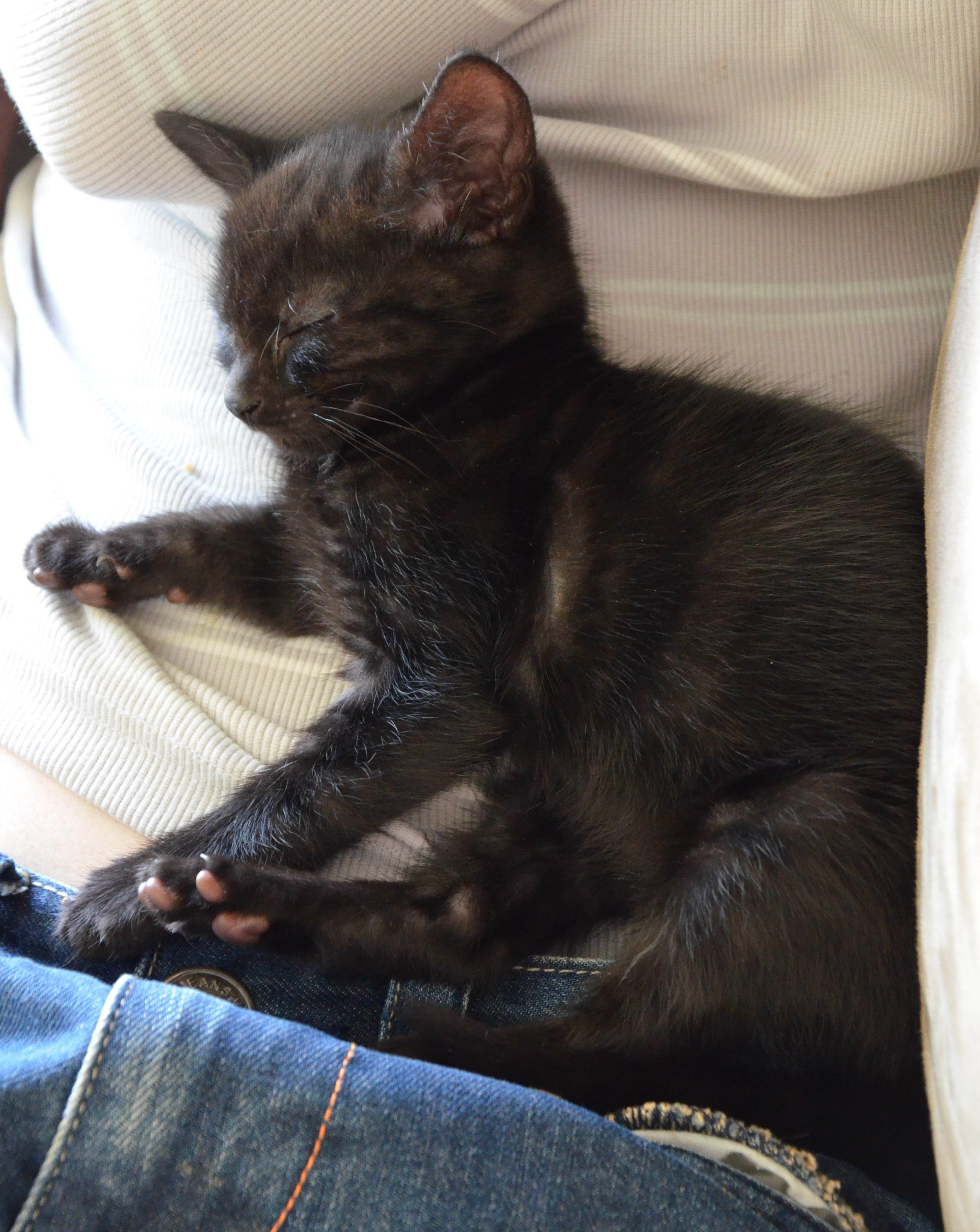 Zoe is very cuddly, playful and energetic kitten. She loves to sit on your lap and play with toys and other kittens. Zoe is quite adventurous and likes to discover new things. She is black but has feint tabby markings underneath that you can see in certain light. She is gorgeous and ready for a loving forever home!