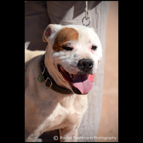 Bailey is a bit of a spunk really. Bailey will bark at you if you are outside his cage but if you go in or if you let him out he usually drops straight on his back for a belly rub. Bailey is good with other dogs and is a Staffordshire Bull Terrier.