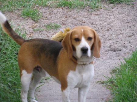 Hi my names bruno and last week my family left me in the pound, luckily for me the shelter managers are fantastic and contacted beagle rescue to come and get me. Im desexed, vaccinated, microchipped, flea, worm and heartworm treated and my foster mum says im a very handsome, well behaved boy and cant understand why anyone would dump me. Im approx 15 inches tall and weigh a very healthy 15. 2 kilos, i smile as often as i can and when my foster mum calls me i come running straight away, i sit for my dinner and most of all i love playing with my foster brothers and sisters and when no one is looking i jump in my foster mums lap for a cuddle because my foster mum tells me im a special boy. Im crate trained (after only 2 nights!), fully housetrained and just love cuddles, walks, humans (espically ones that cuddle me!) and all other dogs. My foster mum says i need to go to a home with another dog so i can play and smile all day long. Im great with children, dogs, humans and did i mention how special i am! im past the chewing, pulling washing of the line and general destruction stage and just want a forever family to cuddle and grow old with. My foster mum also says if you are intrested in me you need secure fencing, another dog and knowledge of the breed