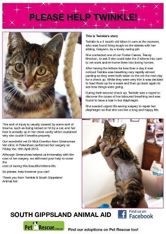 Twinkle has had a very major surgery to repair her torn diaphram. This injury was caused by a trauma such as being kicked. Her liver and intestine were in her chest cavity which restricted her breathing. She has recovered extremely well and is now our very special poster girl. This surgery was life saving but wont cause her any further health issues now that it has been repaired.