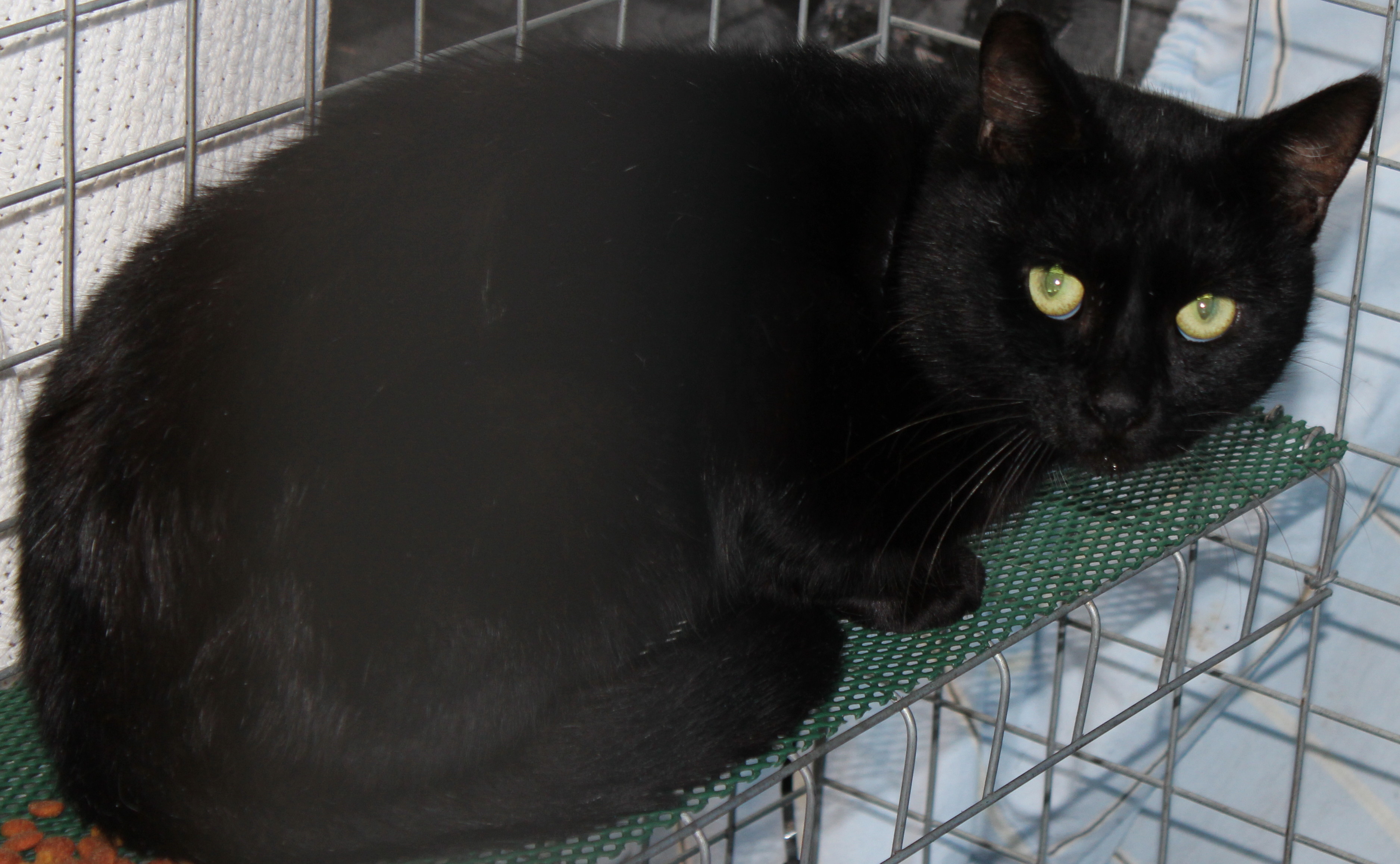 He is Jet Black and a little shy, but not nasty in any way. Gets along well with other cats and doesn't seem worried by the dogs either.