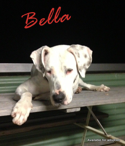 Bella is 12 months old, white with black spots and the size of a Dalmatian. She may also be part Great Dane? Bella looks like a miniature Harlequin Dane with the body size of a (slender) Dalmatian. She is still quite timid but not at all aggressive and gets on well with people (adults and children), with my dog large dog and my daughter's 2 greyhounds. Bella is not bothered by my cat either! Bella sleeps inside with my dog, and is toilet trained. She has also learned a few other commands, mainly by watching and copying Mia.