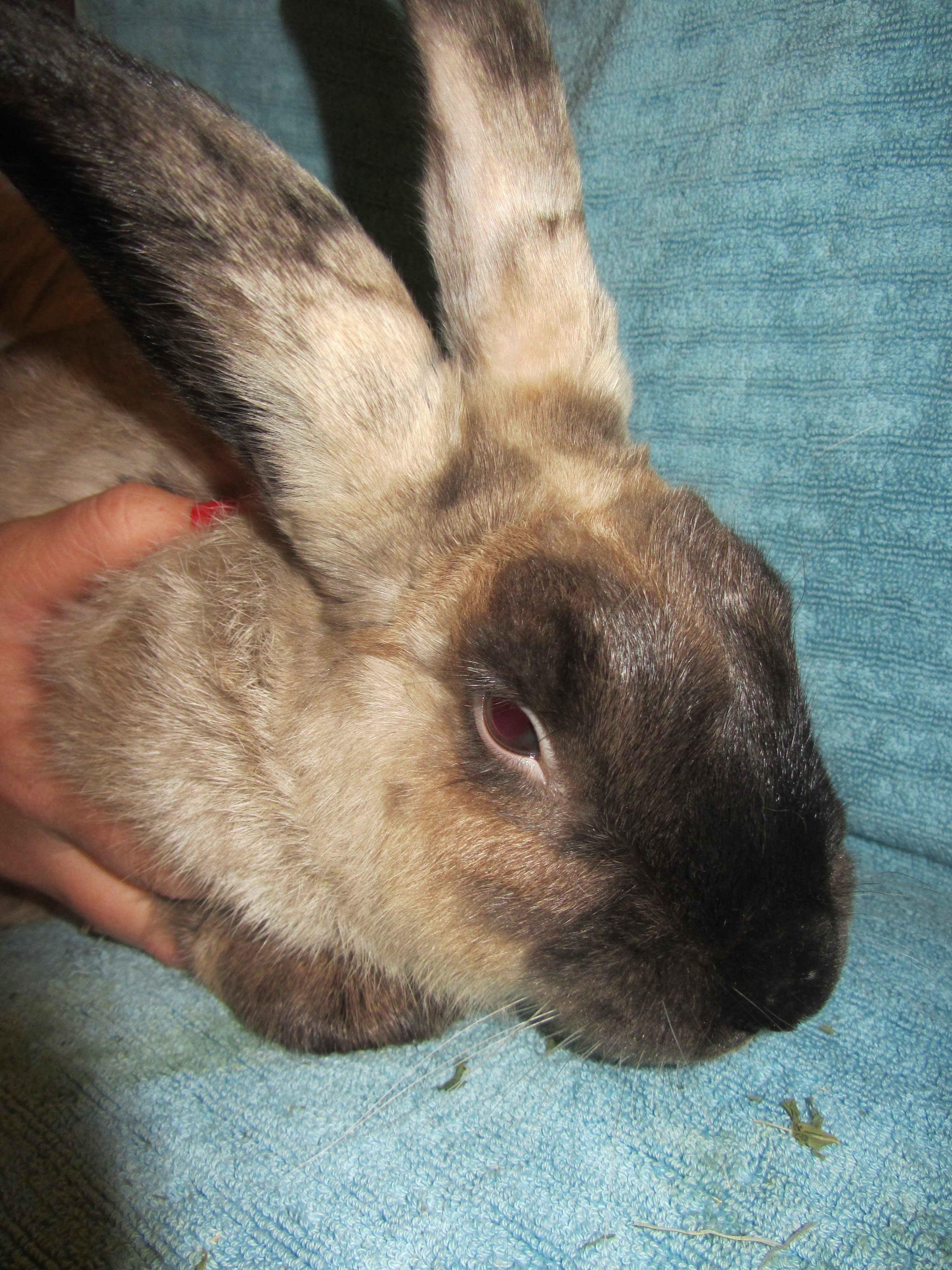 Peter and the 20 other rabbits are now rescued and safe with us. He is a strong willed boy and is bossy with the other rabbits, but very friendly when handled, having constantly been handled by children at a petting zoo before he came to us.