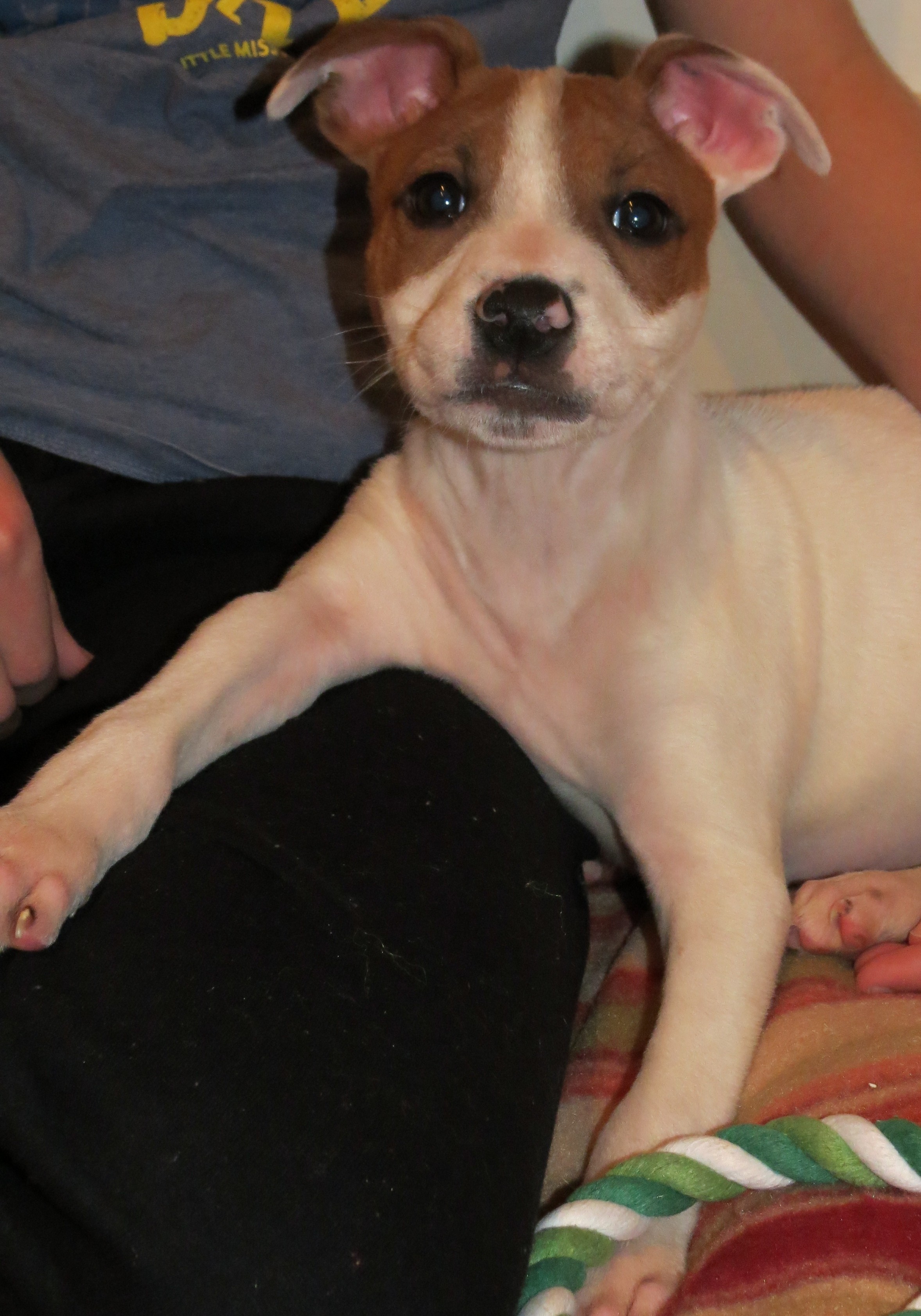 His daddy was a pure bred American Staffy, and his mother was a Staffy x ACD, maybe a little Kelpie there too. Either way, he will be a friendly, family orientated dog, perhaps quite active, and wearing his heart on his sleeve.