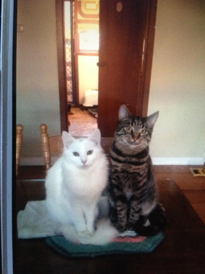 Hi, our names are Lenny (male tabby) and Sponge (white female). We are brother and sister, and we would love to stay together forever. We love to play together and share pats and cuddles <3