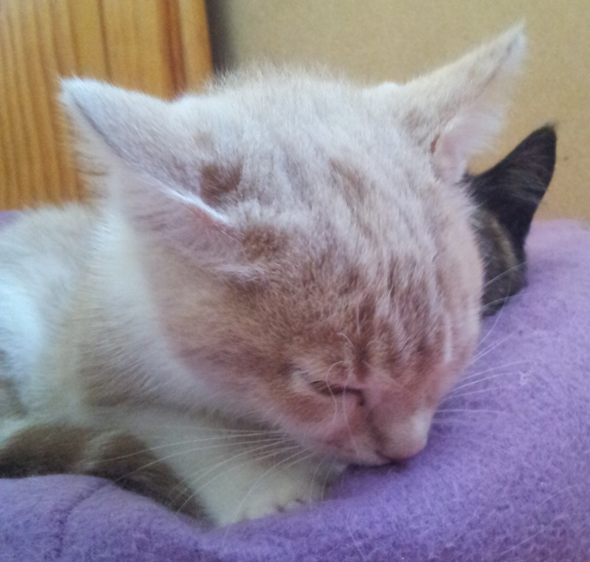 Miss Britney is a real loving, purry little munchkin : ) She's as soft as a cotton ball and such a dainty little lady. She and her gingerbread brother Rusty (also for adoption) were just tiny wee tots at the pound before we rescued them and loved them to bits : ) Britney just loves to be noticed and cuddled - she'll come loving up to you with her little tail flipping side to side just anticipating a snuggle : ) I always catch her sneaking in a wee suckle on the softest pillow she can find - there's a picture there of her doing it on her little purple bed! She's a true darling little sweetheart and any home she's welcomed into will be richer for having her. xo