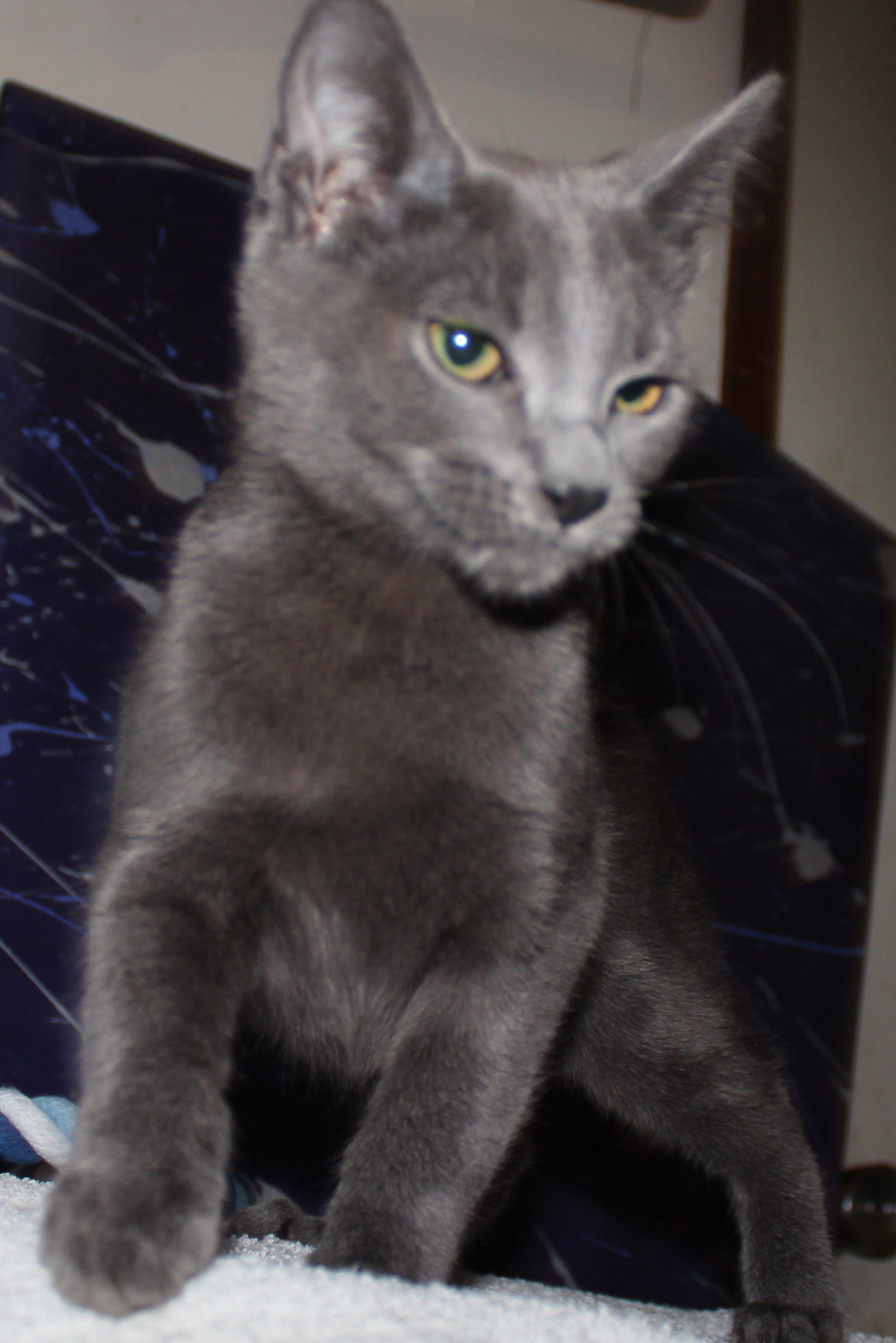 Storm is suspected to be a Russian Blue type cat mixed with an oriental of some sort. Her parents are unknown as she was a stray from a small kitten but you are welcome to make your own judgement.