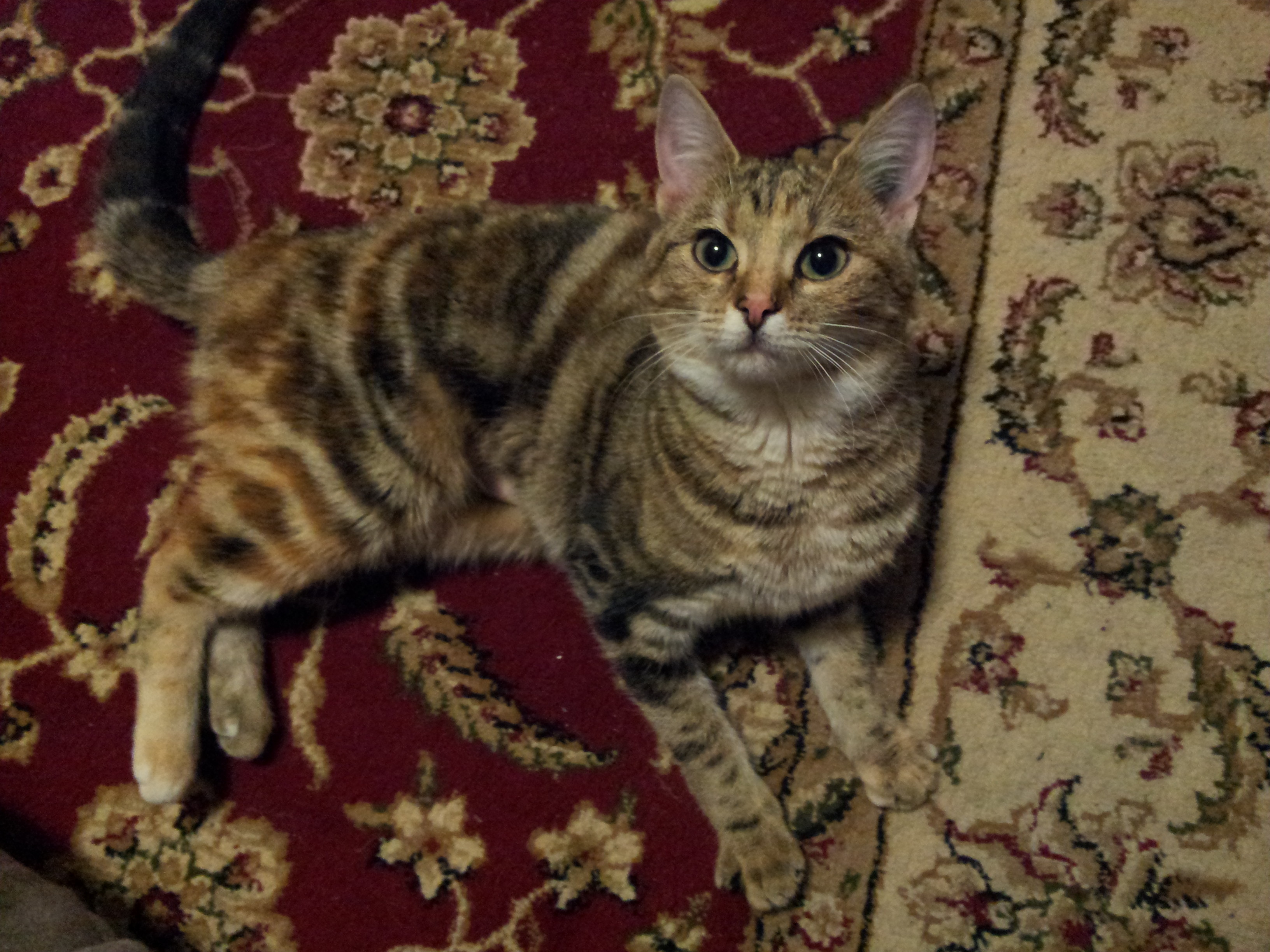 I am a 6 month old tabby girl, and I'm looking for my forever home! \ My foster mum says that I have very beautiful and unusual colouring, with little streaks of red in my black strips and Champaign in my white! She tells me all the time that she loves the white tip of my tail.