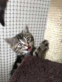 This little cutie was found stuck in a pipe in a factory. He has also been burnt at some stage as well. His whiskas are almost non existstent, and when he came into care he also had some singed hair on his back.