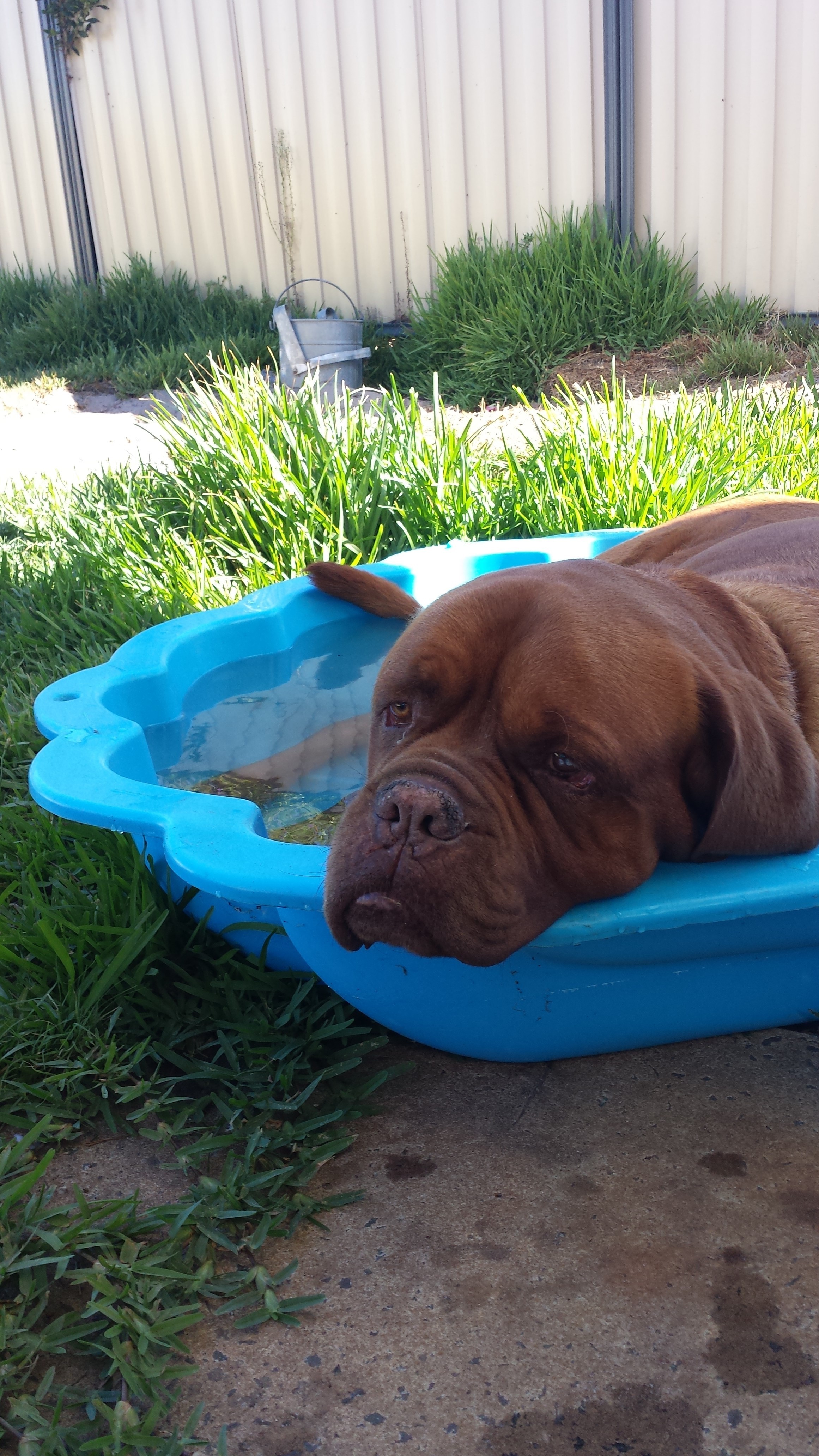 Hooch is a pure male Dogue de Bordeaux who just looooves people. He also equally enjoys lounging around during the day and going for walks in the evenings. He walks well on lead and knows basic commands such as sit and shake. He has a relaxed nature, is happy inside or out and is a lovely affectionate boy. He is a large male weighing approx 70kg and standing around 70cm tall but he really is a soppy gentle giant who enjoys a good pat and tummy rub.