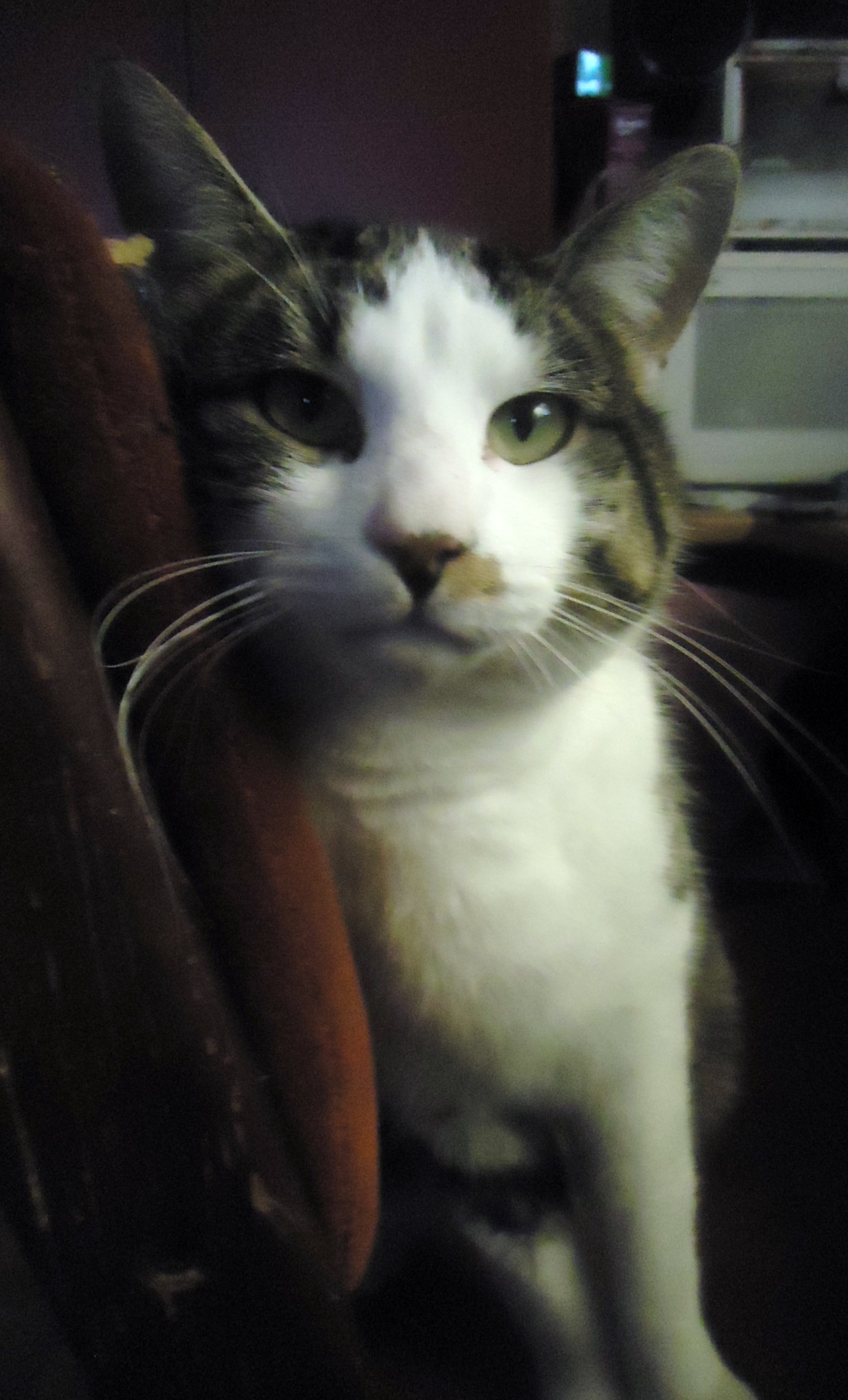 He has a big purr and loves people, especially cuddles and be carried around. He is not keen on dogs and is ok with other cats depending on how they treat him.