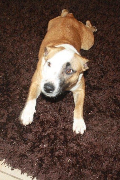 Scrappy is a medium sized smooth coated male Staffy blend who is currently living with six children from six years of age to fourteen and he is brilliant with all of them. Scrappy found himself abandoned at a local animal shelter and how could you resist that face we took him into care and he has fallen on his feet.