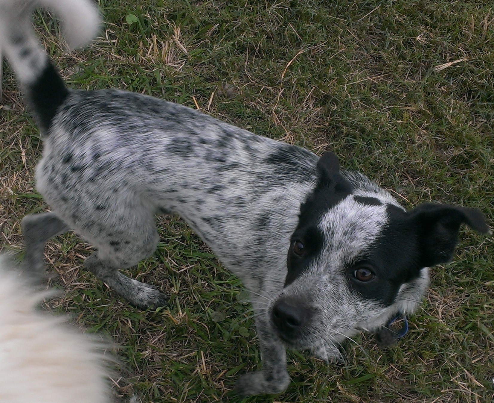 Macka is a classic cattle dog in a smaller package. We aren't sure what he is crossed with, but it has resulted in a miniature blue dog. The dead give away is his lovely tail that plumes up over his back when he's happy. The perfect size for a family with a large house block, macka is big enough to play with the kids, but not so large that he can't come inside and share the lounge.