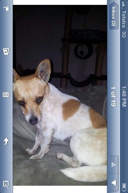 She is learning to walk on lead but most of the time we spend trying to make her walk or even picking her up and carrying her as she just sits down and will not move. It is funny though as we make our other two sit for theirs and she hides under the table lying on her belly until they are eating and only comes out once I put her bowl down. She would really need to be re - homed to someone who will allow her to live inside permantly and if she is not re - homed into a family with other animals, they would need to be home allot as she loves to cuddle up on the couch at night watching TV with me. She also follows me around all the time. She is still very timid with new people and with loud noises but is getting better and getting used to new people quicker.