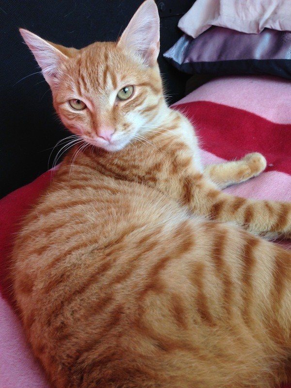 Tibbles is 14 weeks old (Deb’s estimate) and is a total smoosh. Just LOVES being cuddled, picked up, tossed around, doesn’t care how you handle him, just wants to be handled. Doesn’t mind being held upside down like a baby, or over the shoulder, or on the lap, or just hanging off you in any way he can get it. \ Is very good with learning what behaviour is OK and what is not. Smacked Preston a few times and I told him that’s not on, and we can all cuddle together, and since then he seems to be OK with Preston being involved in a group cuddle. \ His little stumpy tail is super cute! He is one of the softest kitties I’ve ever patted too. Loves to give you ‘head bops’ and is a big fan of purring and rubbing his nose against you.