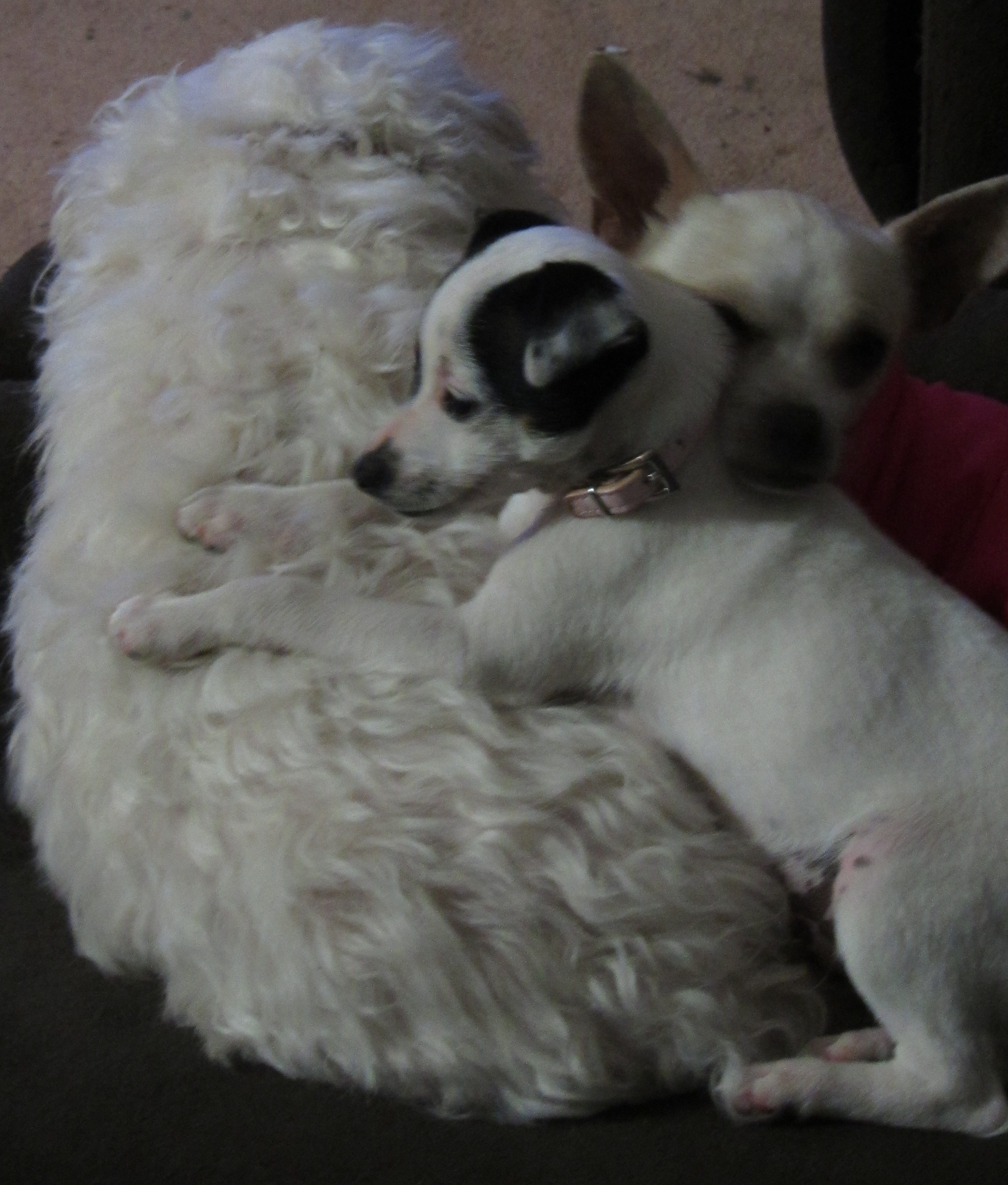 Hope plays well with other dogs and cats...she is super friendly with everyone. Hope sleeps inside in her crate at night and spends the day with another puppy that we have in care...outside enjoying the sunshine. Hope also likes to fall asleep on my lap or perched on my shoulder while I type... I do love this little pup a great deal and she will only go to the best home possible....