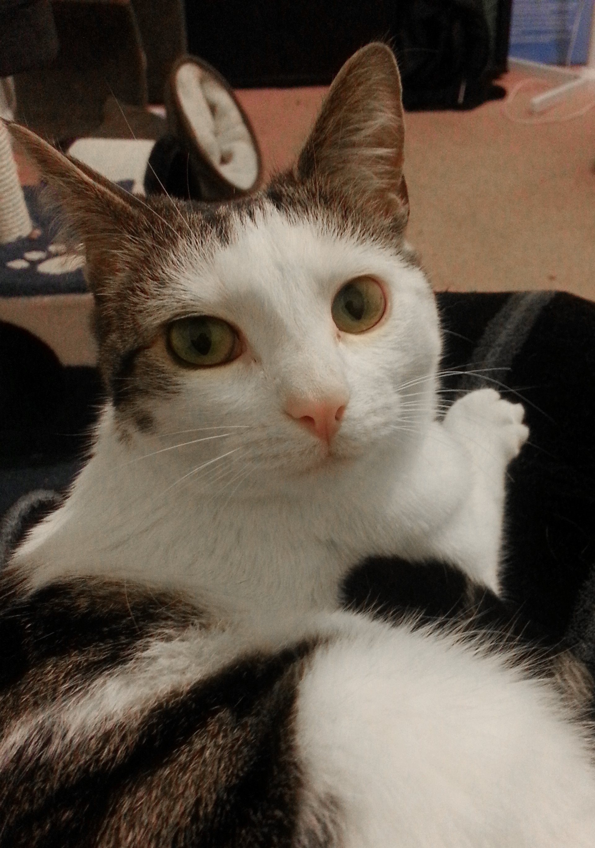 She can still be very playful and kitten-like at times and loves playing with toy mice and she always uses her scratching post and will try to hug it at times.
