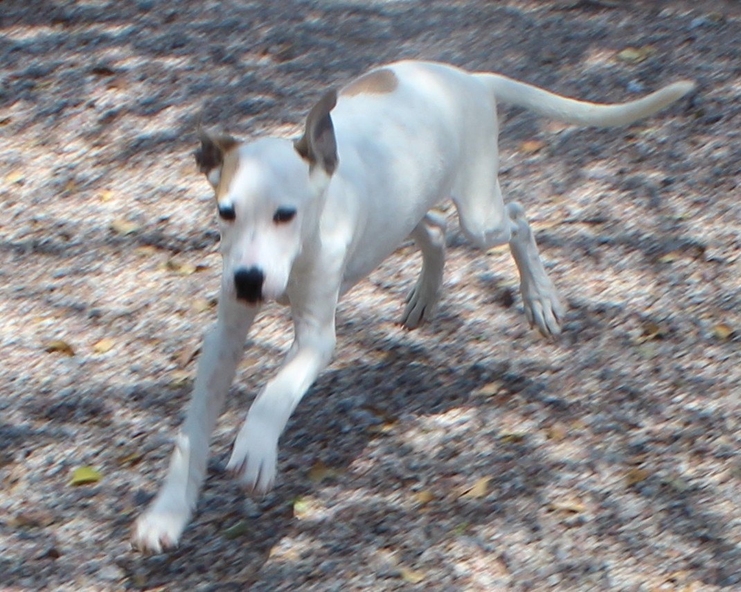 Very cheeky, loads of personality and fun. That pretty much sums up Caddie. She is a confident girl who will become a big dog. She is good with other animals and will require a large yard and/or lots of exercise. She is very active and hard to get a good photo of, but at least she is having fun right?!