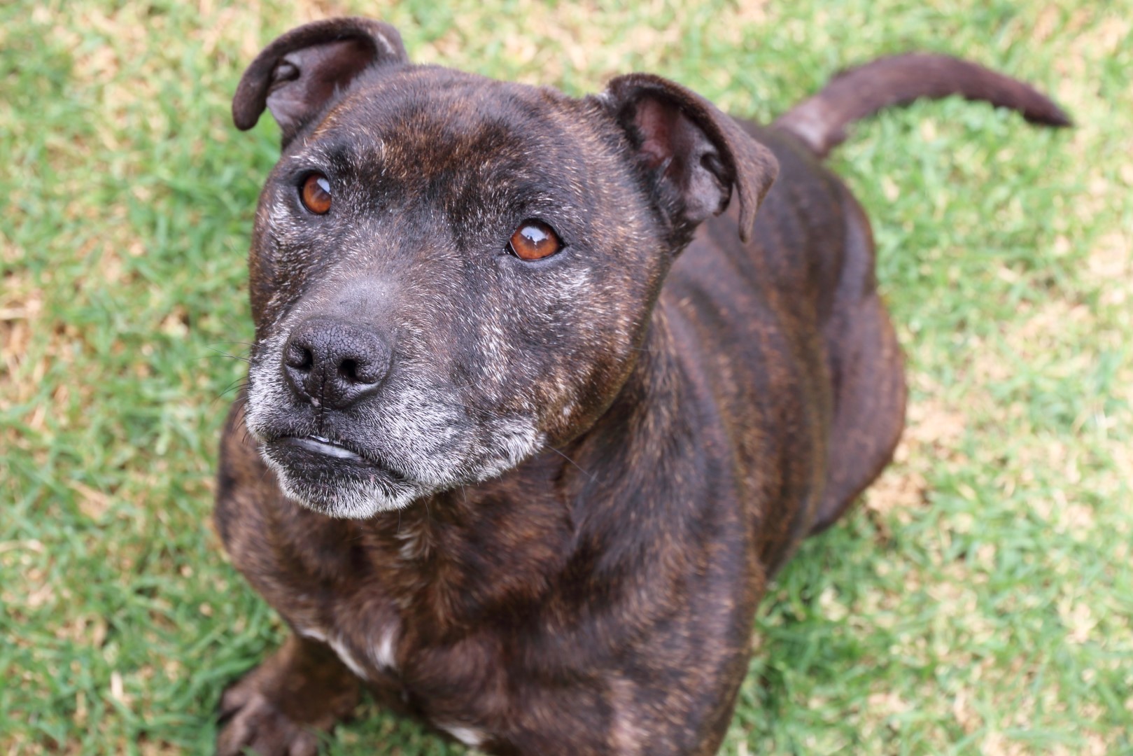 Because of the children, we sleep outside in a kennel and are not allowed inside so we get a little bored and lonely, even though someone is home most of the day. Staffies need to be with people like people need to breathe. Our family understand that they are not giving us the attention we need and have put us up for adoption in the hope that we can find a home to spend the rest of our twilight years. We don't need much, but a couple of nice warm beds inside with the family where we can watch you would be wonderful.