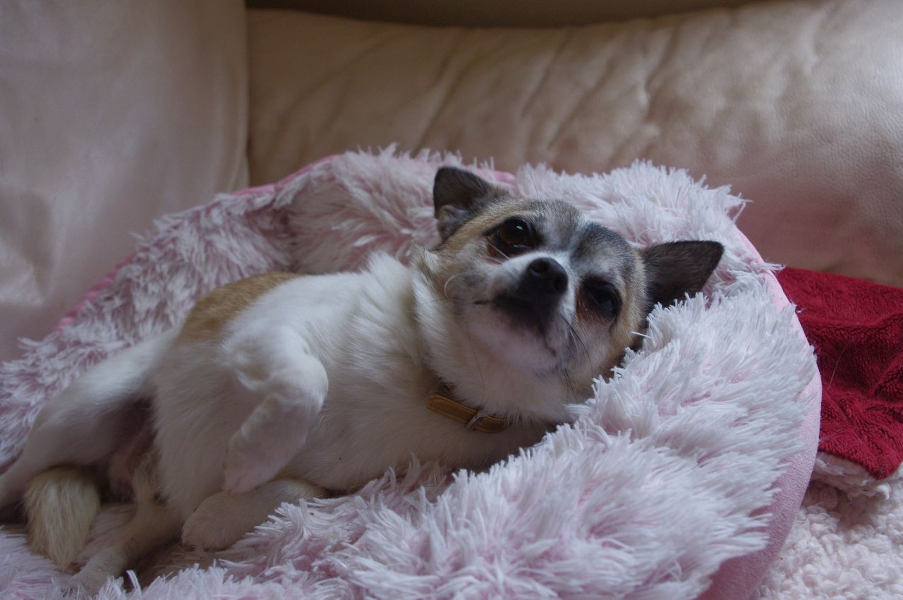 He gets on well with other small dogs and cats. He is not particularly playful, but does like to sleep snuggled up to another dog (or human). He is house trained, and quiet (although like most chis he will let you know if he hears something strange). He likes to go for walks, and is okay off lead provided he isn’t being pestered by big dogs.