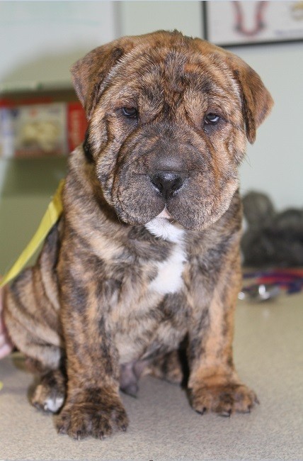 Aramis, what a beauty this boy is with his striking brindle colouring. He has lots of love to give and enjoys his cuddles. He will be a strong boy when he grows up and it is anticipated as with a lot of Shar-pei Athos will need some facial surgery as he grows to address entropia on his eyes.