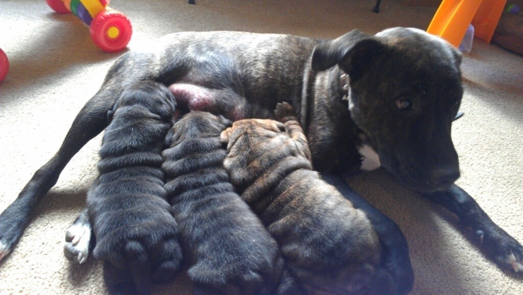 Porthos' mum is a beautiful black brindle staffy. His father is unknown but clearly is a Shar-pei looking at these pups.
