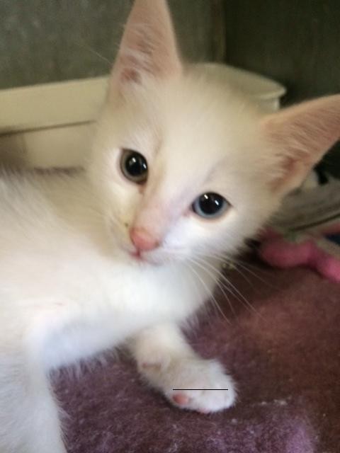 I have one beautiful blue eye and one beautiful green eye. I will grow up to be a big beautiful boy. I do have pink skin, so I will best be suited to being mainly indoors. I love people and belly rubs. I am very gentle and sweet. I will purr and bat at your hands. I am looking for a forever family who I can devote myself to.