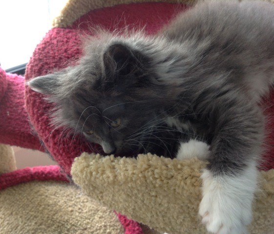 Pebbles is a gorgeous medium haired grey kitten with white paws and very soft fur. Pebbles is very sweet natured and loves attention, especially a rub under her chin, and she rewards you with a beautiful loud purr. Pebbles loves to play and chase little balls or string. She loves to be around people or other cats (but hasn’t met any dogs yet). Her adorable and fun loving nature will make her a great addition to any family.