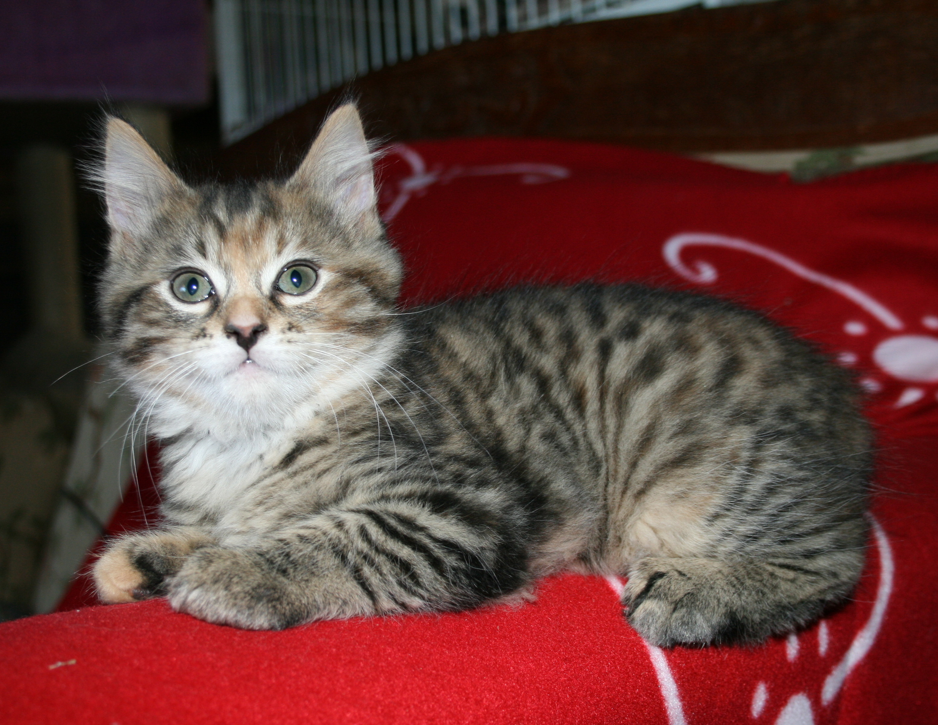 Willow is the most adventurous kitten out of her litter. She loves to be the first one into and onto everything they can find. She was the first one to start eating the first one to use the scratching post. She loves to play and be on the move. Willow will finally have a nap when she has exhausted herself, but if the other kittens look like they are having a lot of fun she will get up and investigate. One of her favourite toys is ribbons on a string and she will leap into the air to try and catch them and not worry about who she is going to land on. Even thou she is a busy girl, Willow still loves her pats and will let you know this with her big purr.
