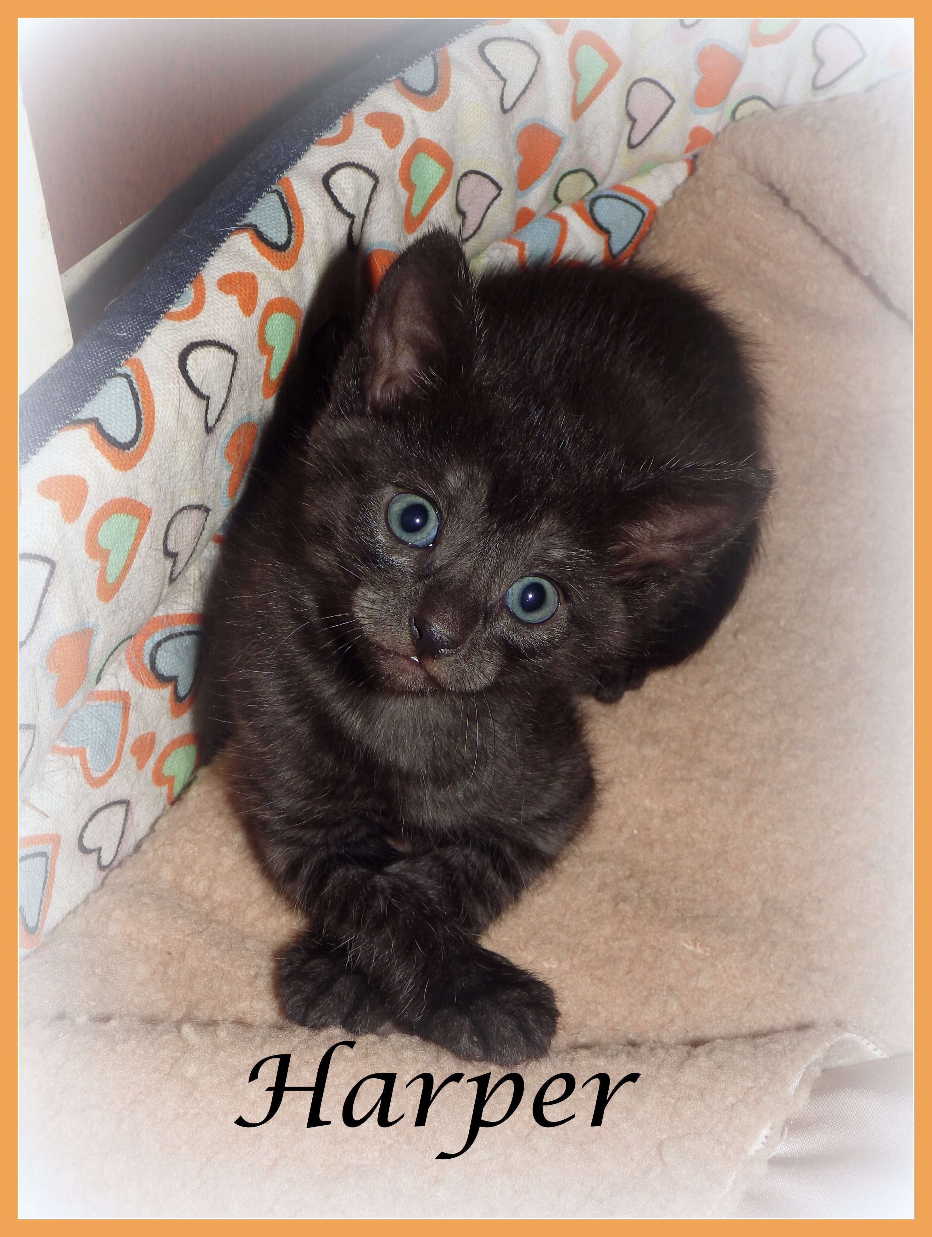 Harper is a happy kitten who gets on well with other cats. She loves to play and snuggle. Litter of 4, siblings are Holly, Harriet and Heather.