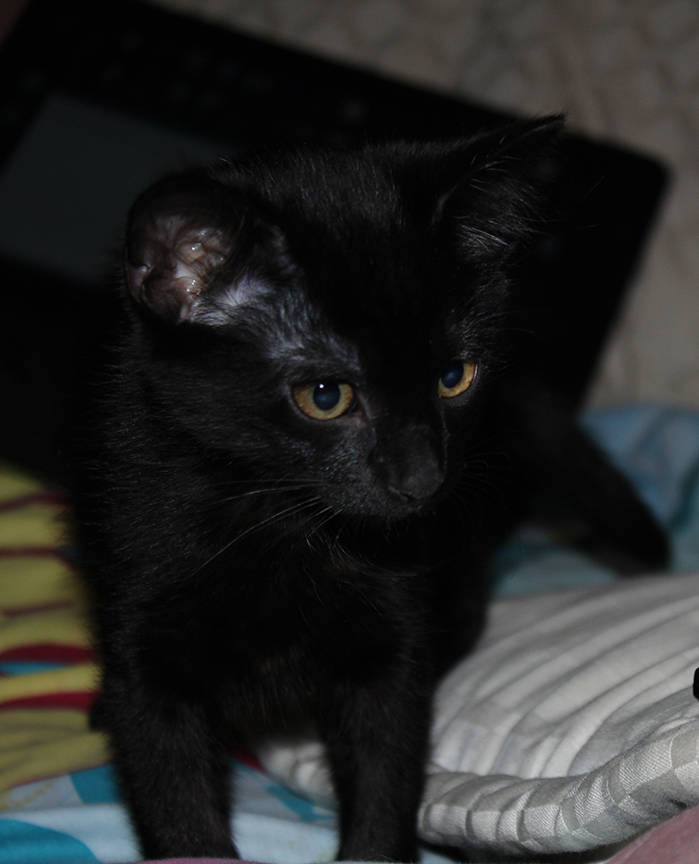Shadow is a gorgeous 10 week old female who is black all over. Shadow is named for her colouring and her affinity with hiding in dark places. This little girl just loves human contact and purrs very loudly at the slightest touch, she's very much a lap cat loving her cuddles and human carer. Shadow is good with children but prefers a quieter household.